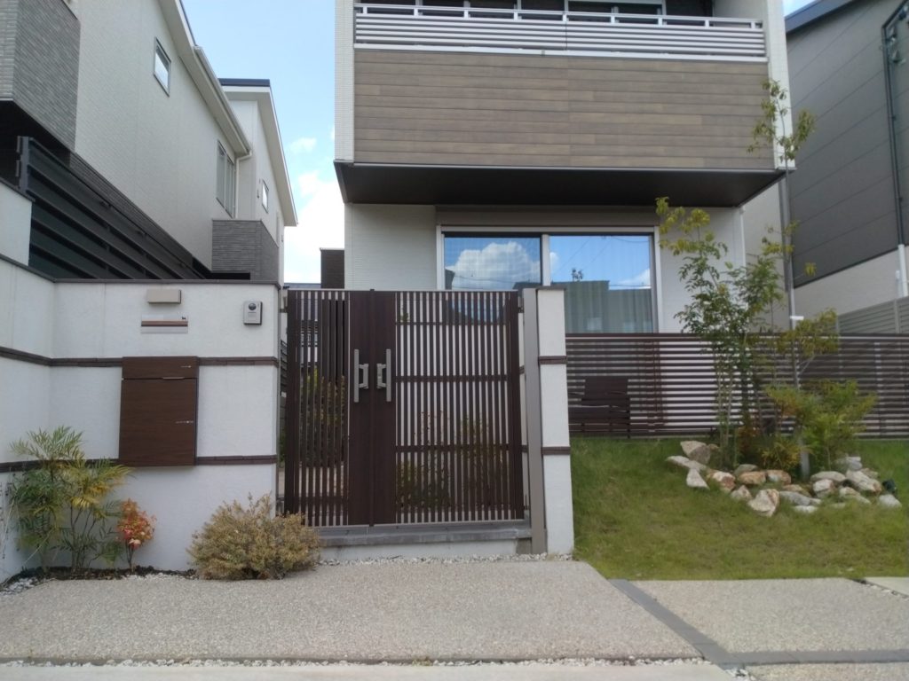 色やデザインをお庭の横格子フェンスとポスト、門柱のタイルなどに合わせてあり、全体的にとてもまとまりのある外観に仕上がりました。