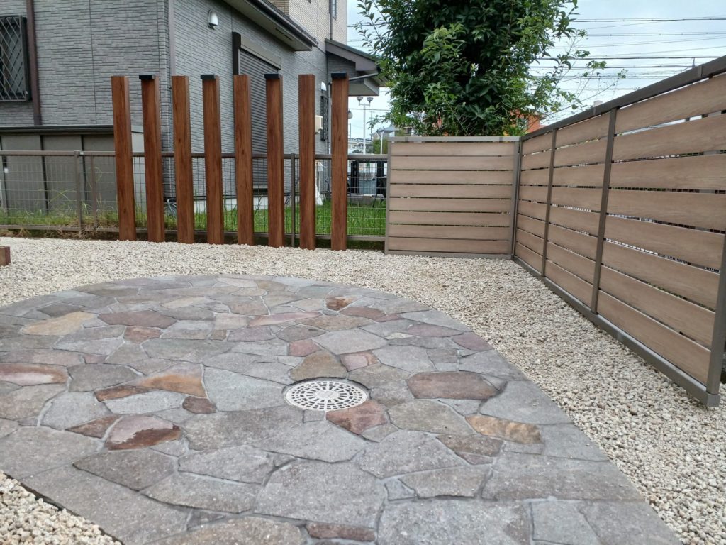 横には枕木で縦のデザインも取り入れ、ただの目隠しだけでなくアクセントをいれたおしゃれな庭まわりになりました。
