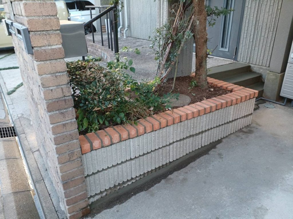 階段はコンクリート仕上げでシンプルに。花壇は化粧ブロックで造り、門柱に合わせてレンガ笠木でコーディネートしました。