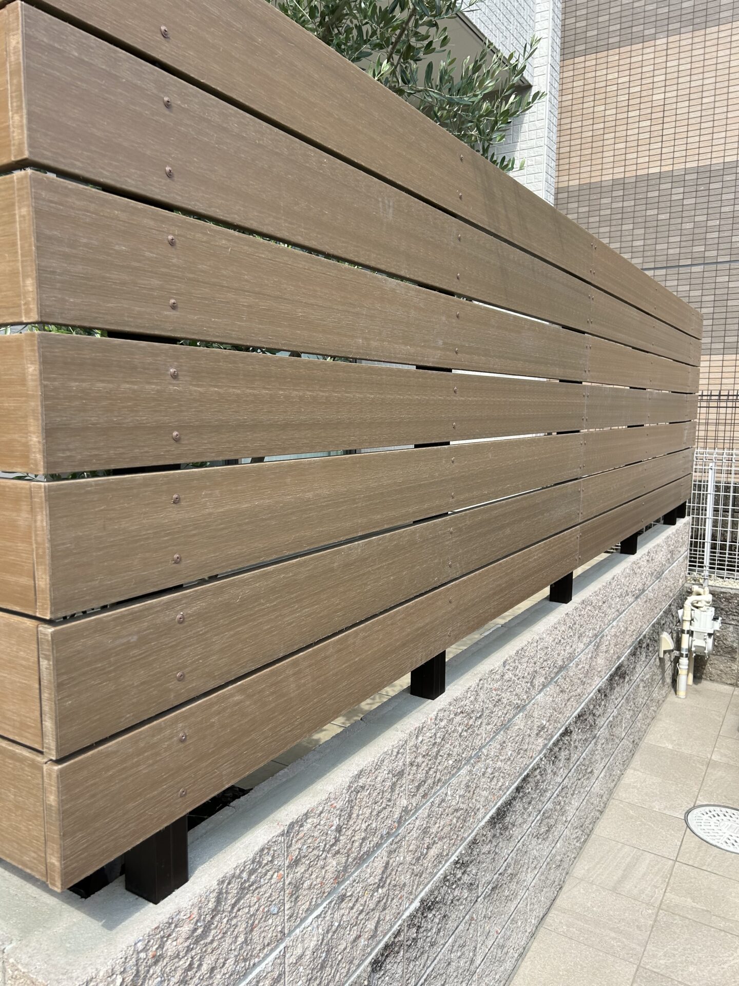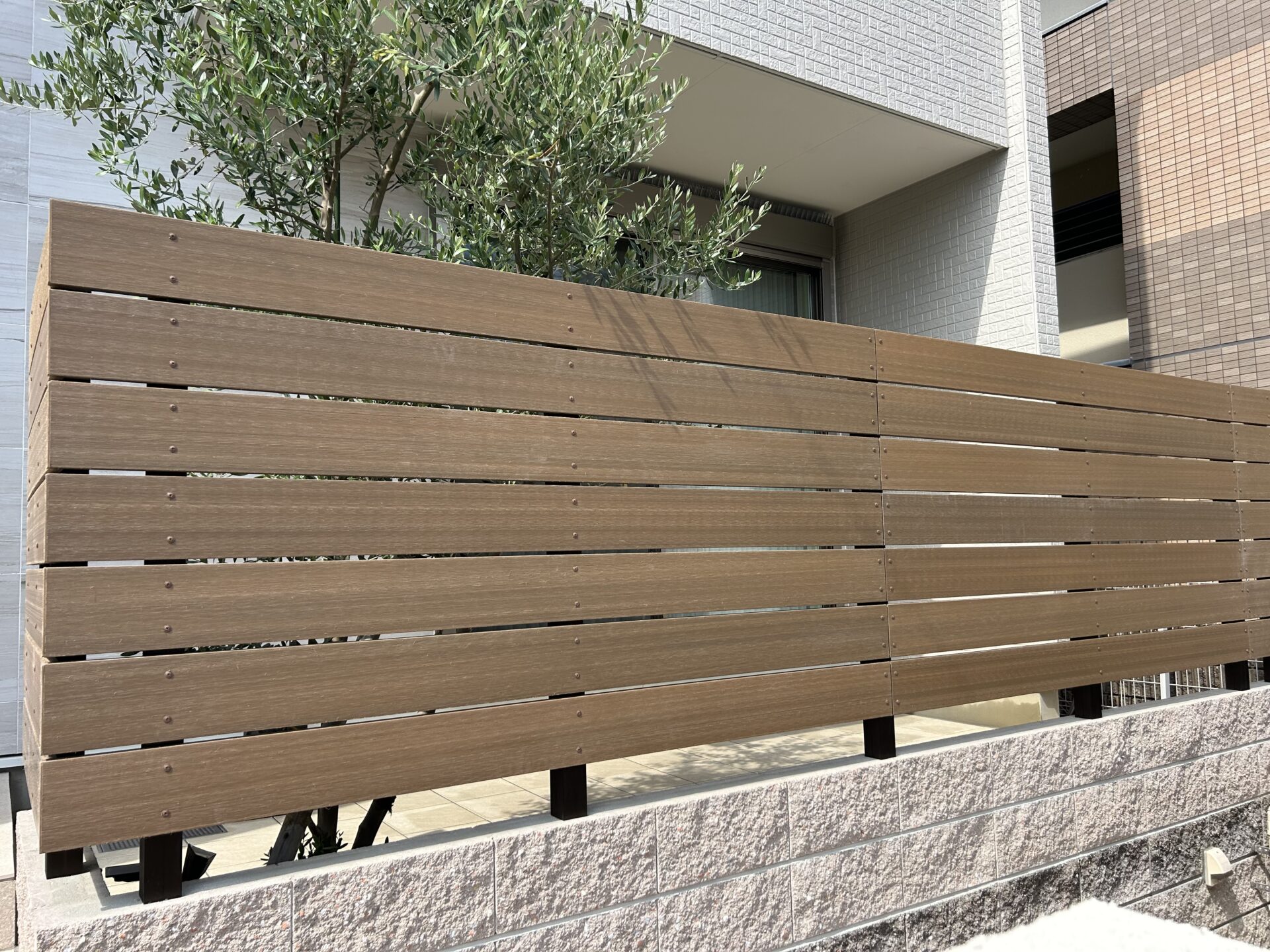 お庭の目隠しは1枚1枚違う模様で天然木のような風合いのある『プラドフェンス』。