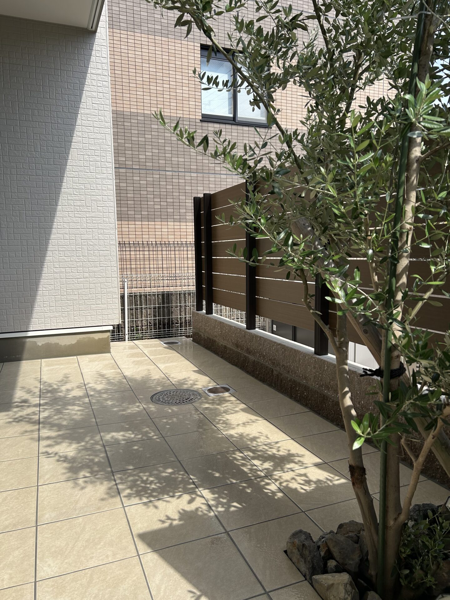 木目のフェンスにシンボルツリーのオリーブが映えるすてきなお庭になりました。