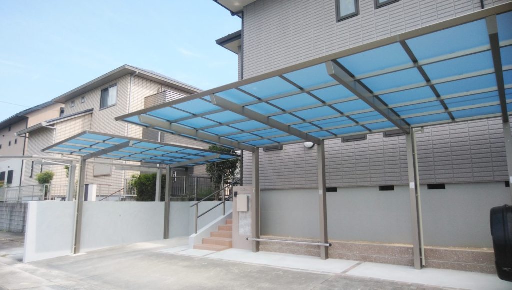 カーポートを2台設置しました。商品は、三協アルミ『セルフィ』。屋根は熱線吸収ポリカ板、色はかすみ調。1台には、サイクルバーを取付けて、自転車置場もつくりました。