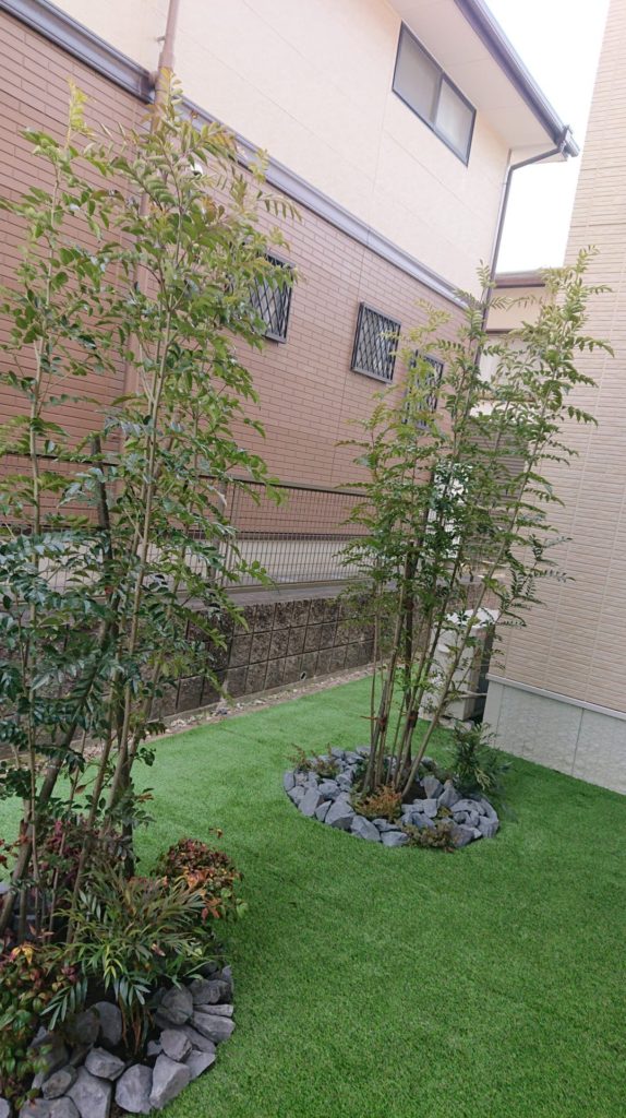 一年程前に境界工事をご依頼いただいたお客様です。完工時に次はお庭を考えているから!と、お話いただいておりました。庭石を据えたお庭をイメージされておりましたが、庭石の搬出入や、将来の草の管理など総合的に考えられ人工芝をお選びいただきました。全面人工芝ではなくシマトネリコを2株、足元には下草とグリ石を据え、季節を感じられるお庭になっています。人工芝はリアリーターフの『アメリカーナロング スポーツ』。太めの高耐久パイルを使用しており弾力があります。ドッグランにも最適な商品です。