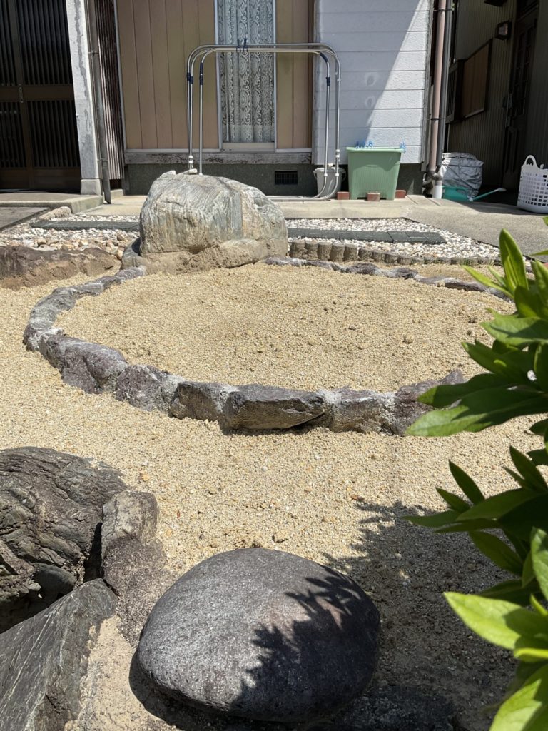 お庭にはご立派な松が何本も植えられていて、以前に剪定などでもお世話になったお客様から、1本の松が枯れてしまったため抜いてほしいとのご依頼を頂きました。植えて4、50年経つ松も病気にかかり枯れてしまったようです。命あるものなので、神主さんにお祓いをお願いしたのち抜きました。(その様子はまた投稿致します。)その後この場所は、Only One「ゴロタ石」で円形の花壇に。これからここは花を植えたり、ミニトマトを植えたりと楽しまれるようです。