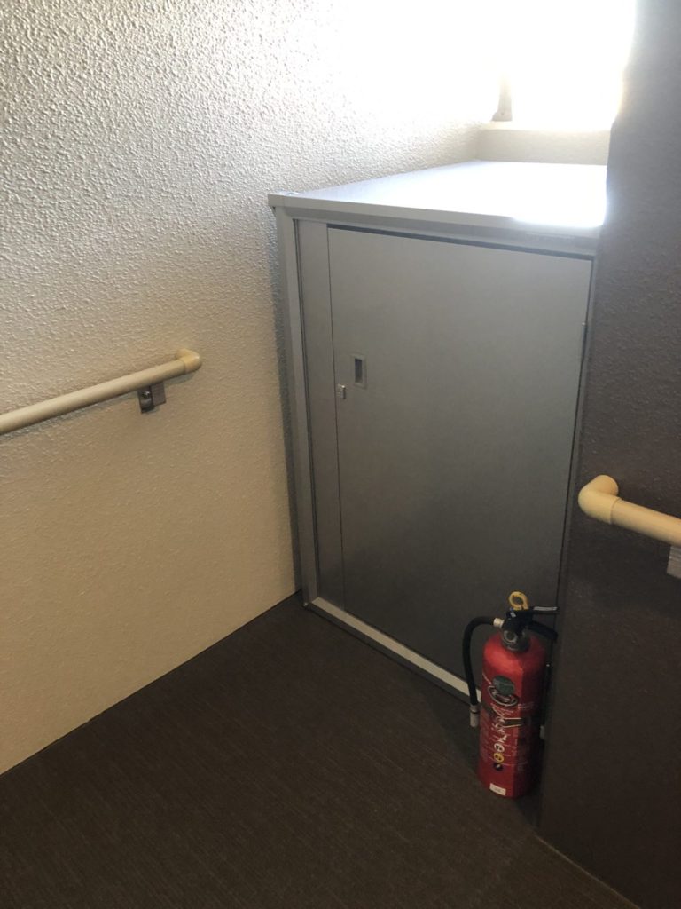自治会様よりご依頼があり、マンションの各階にヨド物置のエスモを、防災倉庫として設置しました。